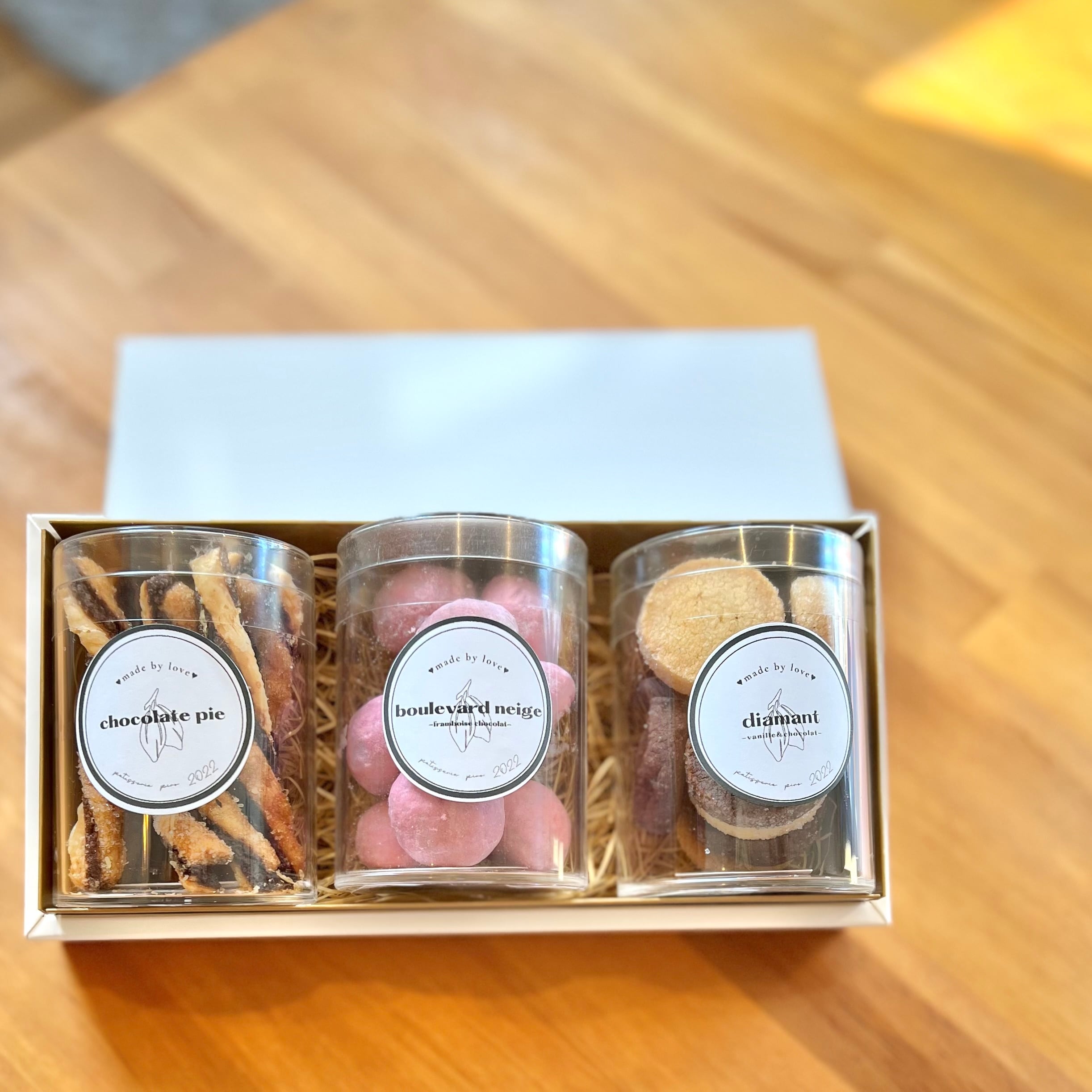 円筒ケースで揃えた、3種類の焼き菓子を