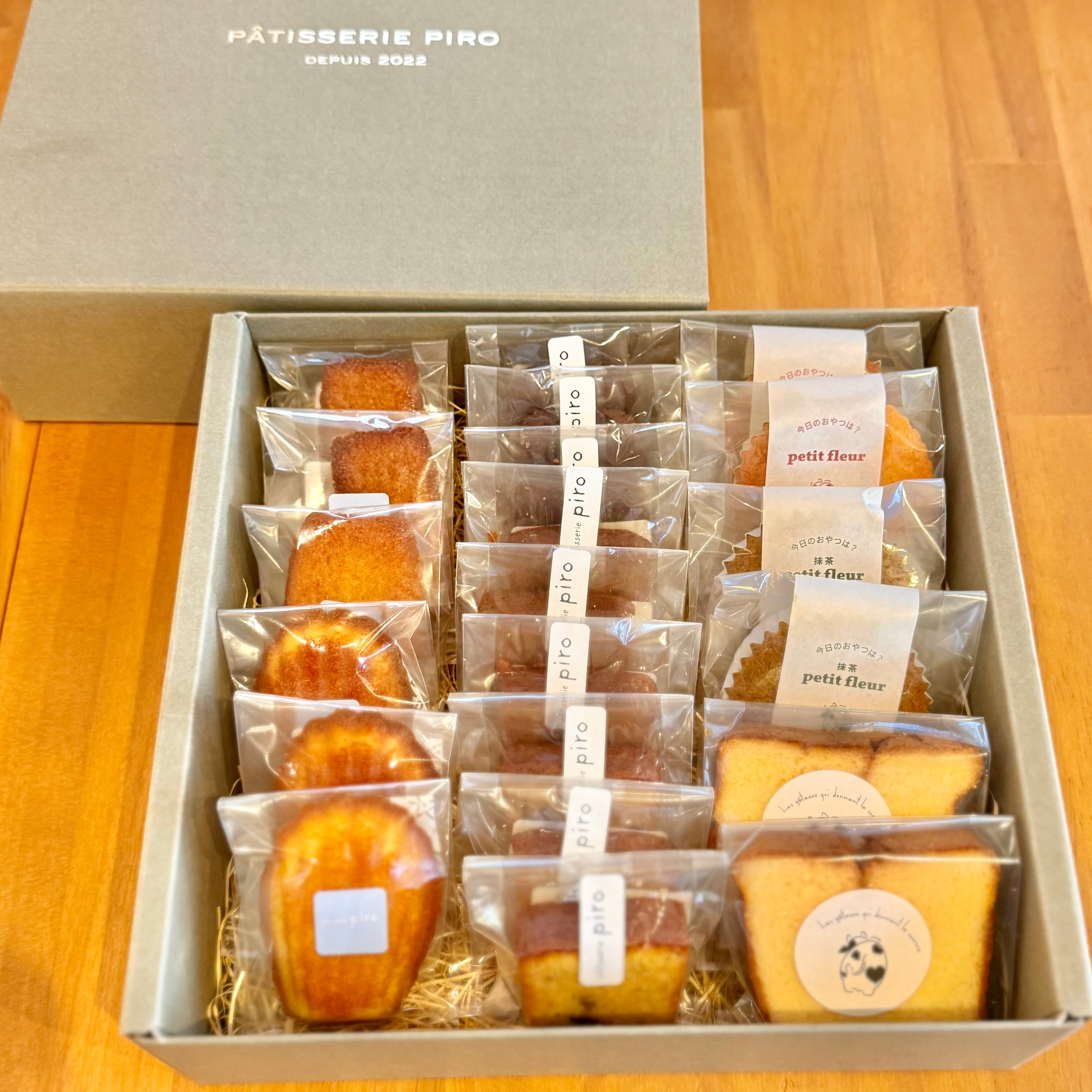 塩バターケーキをはじめ、piroの定番の焼き菓子8種類をギフトボックスに21点詰め合わせました。