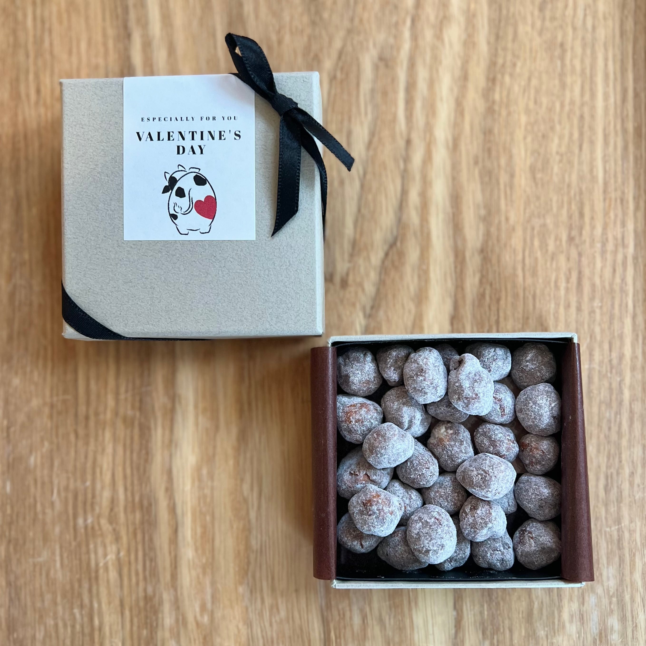 キャラメリゼした香ばしいヘーゼルナッツを、カカオ分33.6%のベルギー産ミルクチョコレートでコーティングし、粉糖をまぶしました。